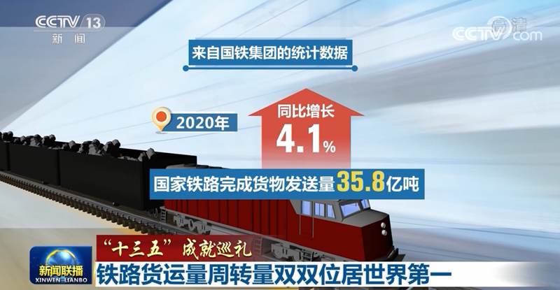 来自国铁集团的统计数据,2020年,国家铁路完成货物发送量35.8亿吨,同比增长4.1%。“十三五”期间,铁路货运量占全社会的比重由2016年的7.7%提高到2020年的9.9%。铁路货运量和货运周转量双双位居世界第一。
