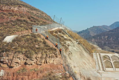 2月9日,在郑太高铁太焦段的太谷隧道附近,申源(左一)和工友沿山体攀爬(无人机照片)。新华社记者 柴婷 摄