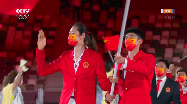 女排运动员朱婷、跆拳道运动员赵帅高擎五星红旗,中国体育代表团步入东京奥林匹克体育场。