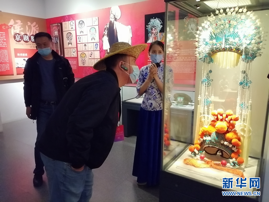 10月21日,“中国有约”2021年国际媒体主题采访记者团一行来到天津市,探访坐落于和平区民园广场二层的非物质文化遗产展览博物馆。图为一位外籍记者在许氏戏曲盔头制作技艺的实物前凝神观看。新华网记者 侯强 摄