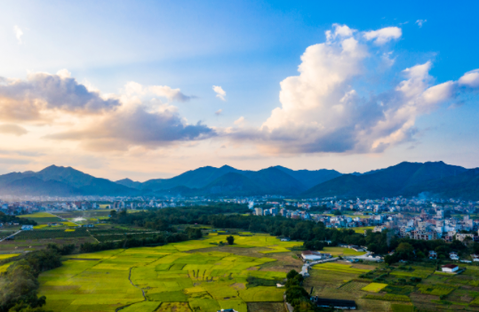 △2021年11月6日,广西梧州岑溪市归义镇,民居、田园与绿水青山相映成趣,构成一幅美丽乡村画卷。