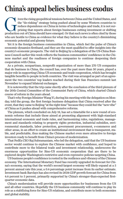 本次率代表团来华的美中贸易全国委员会董事会主席、美国联邦快递集团总裁兼首席执行官芮思博就表示,美国企业界对继续深耕中国市场充满信心,并希望为双边贸易和投资关系作出更大贡献。这也凸显出尽管华盛顿方面对中国持续进行限制甚至打压,但中美经济合作始终空间巨大,尚有无数机遇等待探索。