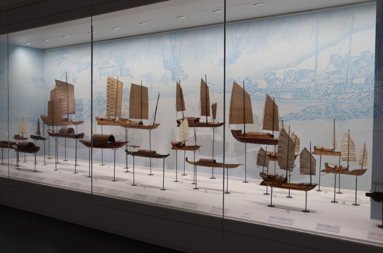 馆内陈列着各种舟船模型、造船航海技术示例、海外民俗器物和外销陶瓷器。透过展窗,千年前的中国与世界各国不同文明交流互鉴、互融共生的场景仿佛再现眼前——海面上,一艘艘满载瓷器、丝绸、茶叶的福船扬帆远航,同时远道而来装满异域珍宝的番舶缓缓入港。码头边,船舶桅杆林立,货物堆积如山,不同肤色、不同国度的商贾、水手比肩接踵。