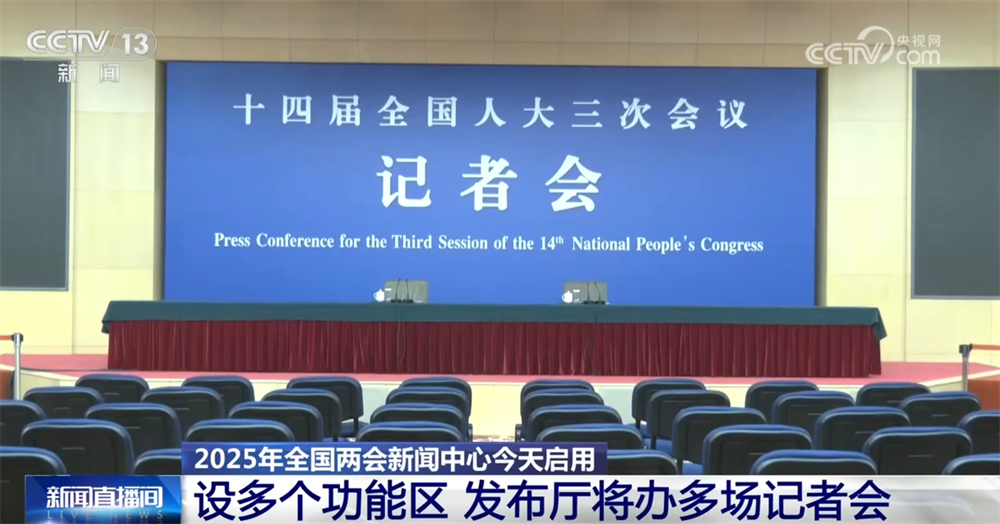 与往年相同,今年全国两会新闻中心设置了多个功能区,其中,新闻发布厅和采访室等已经布置完毕。