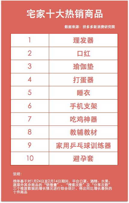 2月19日,新电商平台拼多多发布“宅家十大热销商品”榜单。该榜单基于对1月24日至2月14日期间,平台口罩、酒精、水果、蔬菜外其余商品的“销售量”、“搜索次数”及“分享次数”三个维度数据的增长情况进行综合统计,得出同比增长最快的十件商品。