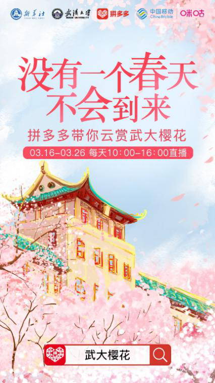 凯发k83月17日讯(本网记者 陈楠)武汉的疫情尚未彻底结束,但樱花已经如期盛开。从3月16日起直到3月26日,拼多多将连续11天,通过多多直播的方式,联合武汉大学、新华社、咪咕等平台从每天早上10点到下午4点,为平台5.85亿用户开启在线“云赏樱”的窗口。 用户只需在拼多多APP里搜索“武大樱花”,就能直抵武汉大学樱花盛开的校园,欣赏春天里的绚烂美景。用户还能在相关专题页面,下单购买樱花酥等应景的武汉特产。
