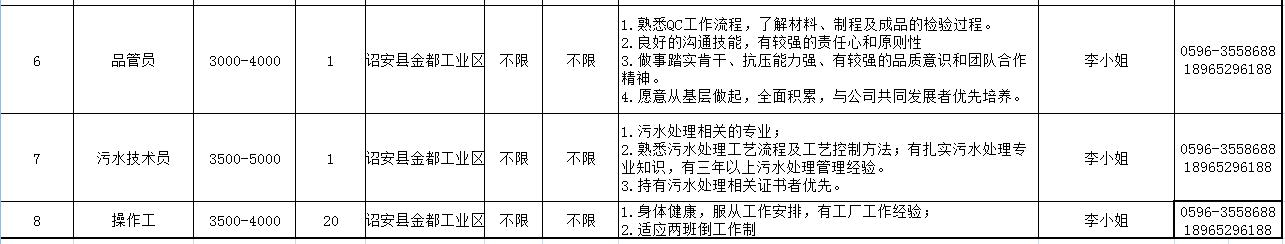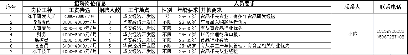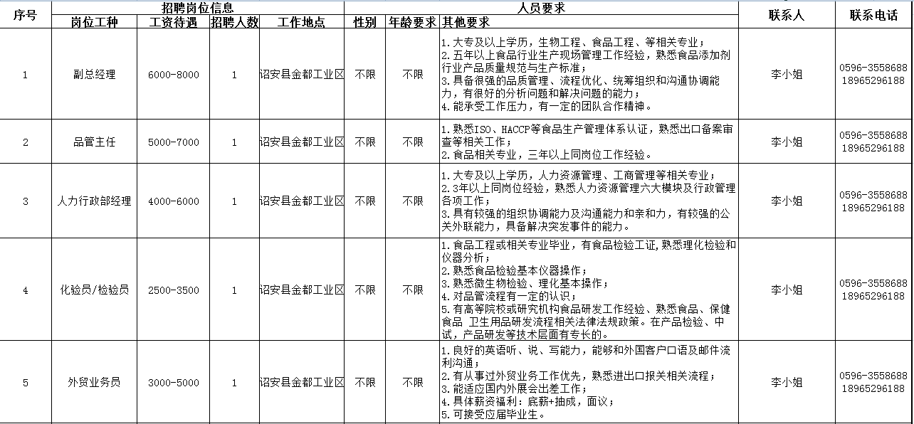 招聘企业信息如下: (可下载表格查看详细信息) 一、福建合口味食品工业有限公司 企业简介:福建合口味食品工业有限公司依托于深圳市合口味食品有限公司平台,2009年斥资1.2亿在富有“中国海峡硒都”、“长寿之乡”美誉的福建诏安建立生产基地,基地工业园占地205亩,生产车间4万平方平。公司始终秉承“真爱真品质”的企业理念、“爱心赋食品、食品如人品”的经营理念,主要生产包子、馒头、花卷、云吞、水饺、汤圆、粽子等冷鲜速冻食品。以无添加香精色素为生产标准,以中国传统餐厨美食工业化为己任,追求速冻冷鲜食品研发与技术革新,并在行业内率先通过SGS-ISO22000管理体系认证。荣获“深圳市农业龙头企业”、“首届深圳老字号企业”、“福建省农业产业化龙头企业”、“诏安纳税大户”等荣誉称号。 企业地址:福建诏安县深桥镇雨亭168号