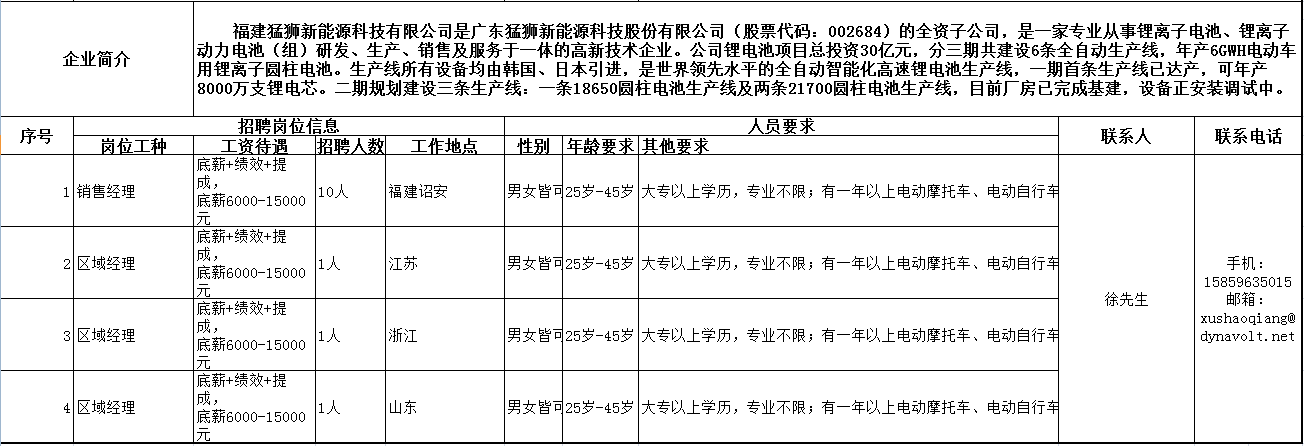 四、福建猛狮新能源科技有限公司 企业简介:福建猛狮新能源科技有限公司是广东猛狮新能源科技股份有限公司(代码:002684)的全资子公司,是一家专业从事锂离子电池、锂离子动力电池(组)研发、生产、销售及服务于一体的高新技术企业。公司锂电池项目总投资30亿元,分三期共建设6条全自动生产线,年产6GWH电动车用锂离子圆柱电池。生产线所有设备均由韩国、日本引进,是世界领先水平的全自动智能化高速锂电池生产线,一期首条生产线已达产,可年产8000万支锂电芯。二期规划建设三条生产线:一条18650圆柱电池生产线及两条21700圆柱电池生产线,目前厂房已完成基建,设备正安装调试中。 企业地址:福建省漳州市诏安县金都工业集中区