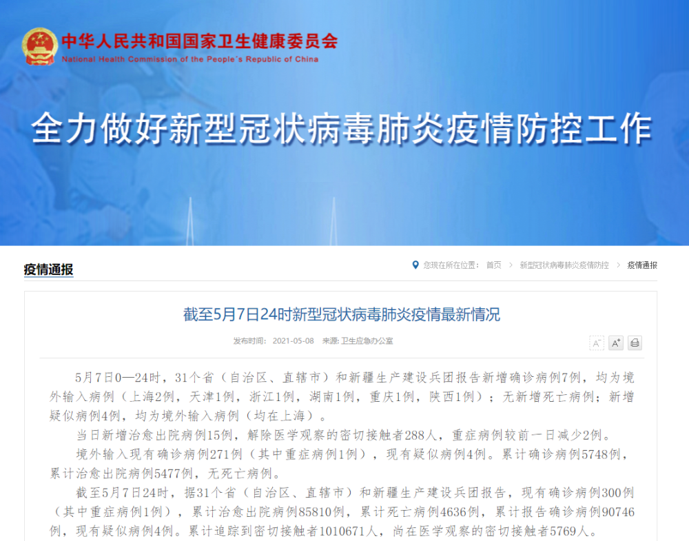 截至5月7日24时新型冠状病毒肺炎疫情最新情况 5月7日0—24时,31个省(自治区、直辖市)和新疆生产建设兵团报告新增确诊病例7例,均为境外输入病例(上海2例,天津1例,浙江1例,湖南1例,重庆1例,陕西1例);无新增死亡病例;新增疑似病例4例,均为境外输入病例(均在上海)。 当日新增治愈出院病例15例,解除医学观察的密切接触者288人,重症病例较前一日减少2例。 境外输入现有确诊病例271例(其中重症病例1例),现有疑似病例4例。累计确诊病例5748例,累计治愈出院病例5477例,无死亡病例。 截至5月7日24时,据31个省(自治区、直辖市)和新疆生产建设兵团报告,现有确诊病例300例(其中重症病例1例),累计治愈出院病例85810例,累计死亡病例4636例,累计报告确诊病例90746例,现有疑似病例4例。累计追踪到密切接触者1010671人,尚在医学观察的密切接触者5769人。 31个省(自治区、直辖市)和新疆生产建设兵团报告新增无症状感染者8例(均为境外输入);当日转为确诊病例2例(均为境外输入);当日解除医学观察11例(均为境外输入);尚在医学观察的无症状感染者313例(境外输入306例)。 累计收到港澳台地区通报确诊病例13028例。其中,香港特别行政区11801例(出院11473例,死亡210例),澳门特别行政区49例(出院49例),台湾地区1178例(出院1077例,死亡12例)。