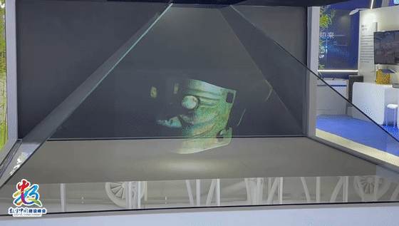 三星堆文物通过 3D全息投影技术 将文物影像悬浮在柜体实景中 实现具有360°绝对可视的特效 纵深感非常强
