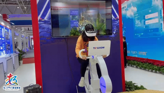 这是VR动感单车 骑行和VR场景相结合 一边骑车健身 一边能欣赏美景或是体验极限运动 翻山越岭过独木桥 遇到障碍物还能有真实的跨越感 仿佛在参加环宇宙自行车登山赛