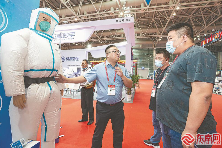 参展商介绍新型防护服。福建日报记者 林熙 摄