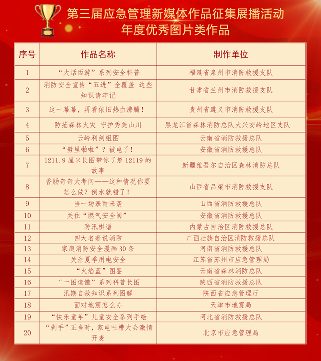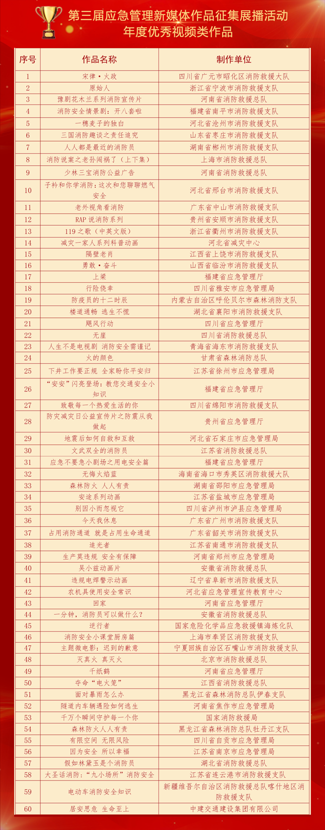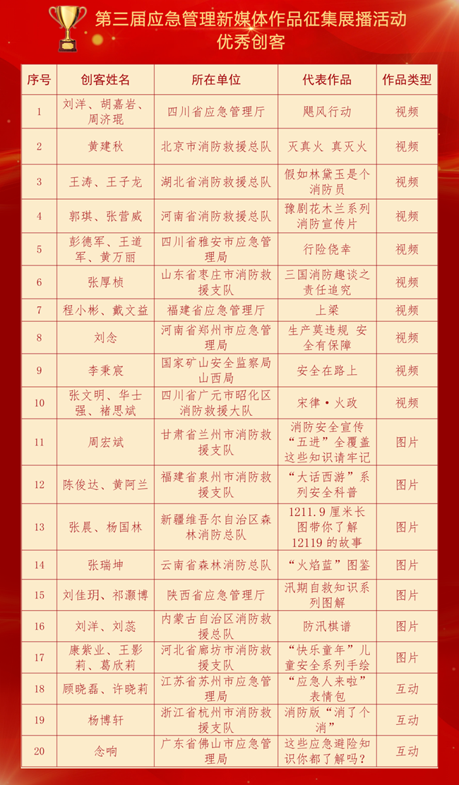 为深入贯彻落实席大大总书记关于应急管理重要论述,充分展示我国安全生产、防灾减灾救灾和应急救援工作改革发展成就,进一步提高社会公众公共安全意识和自救互救能力,根据《应急管理部办公厅关于举办第三届应急管理新媒体作品征集展播活动的通知》(应急厅函〔2022〕71号),新闻宣传司于2022年3月至2023年2月组织开展了第三届应急管理新媒体作品征集展播活动,共征集到400多个单位推荐报送的视频、图片、互动类新媒体作品2107件。 通过对报送的新媒体作品进行初步审核、网络投票、专家评审等程序,评选出《勇敢·奋斗》等90件年度优秀新媒体作品(其中视频类60件,图片类20件,互动类10件),优秀创客20名,优秀组织单位10个。现将获奖名单予以公布。