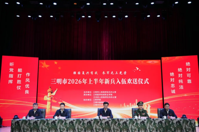 大会在激昂雄壮的国歌声中拉开帷幕。新兵们身着戎装,个个精神抖擞、英姿飒爽。少先队员为全体新兵佩戴红花;市领导为新兵代表颁发《入伍批准书》以及大学毕业生一次性奖励金等;新兵代表和新兵家长依次上台发言。 明溪县 3月19日,明溪县举行2026年上半年“迎老兵、送新兵”大会。