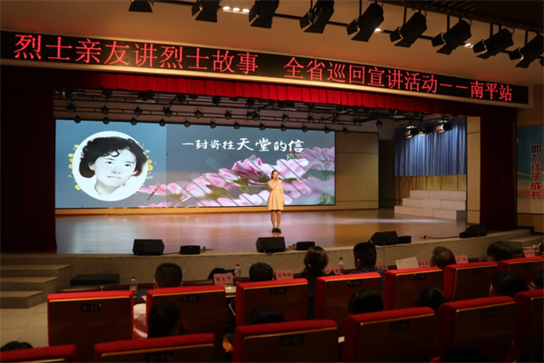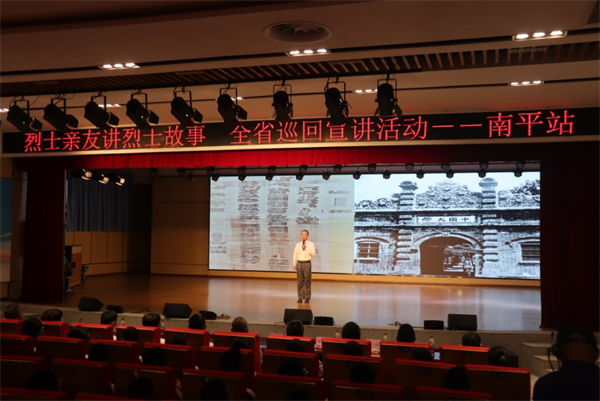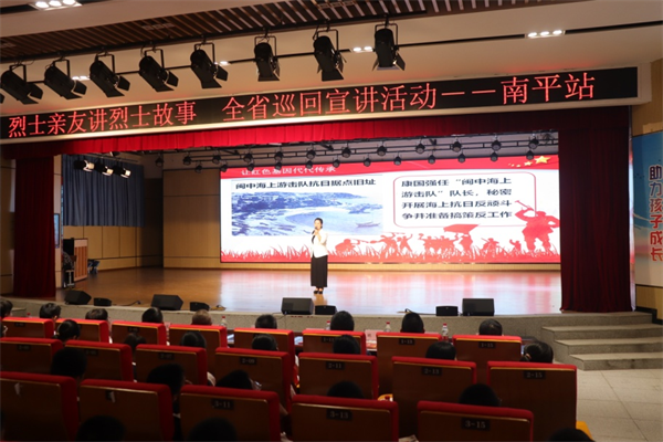 讲好党的故事、革命的故事、英雄的故事,把红色基因传承下去。10月16日下午,由省委宣传部、省退役军人事务厅、省军区政治工作局、福建广电网络集团联合主办的全省“烈士亲友讲烈士故事”巡回宣讲活动走进南平市第一中学武夷校区。省退役军人事务厅党组成员、副厅长蔡静南和省市有关部门领导出席活动。 巡回宣讲活动以“传承红色基因,激扬奋进力量”为主题,共邀请6名烈士亲友参加,讲述了八闽英烈保卫国家、保护群众和舍生忘死的英勇事迹。一个个感人的故事让在场的老师和学生沉浸在英雄烈士的光辉事迹里,接受着精神的洗礼,深刻地激发着他们爱国的热情和对民族、国家的社会责任感、历史使命感。 活动在《致敬八闽英烈》视频短片中拉开序幕,随着雄壮的国歌声响起,全体人员肃立,默哀致敬英烈。