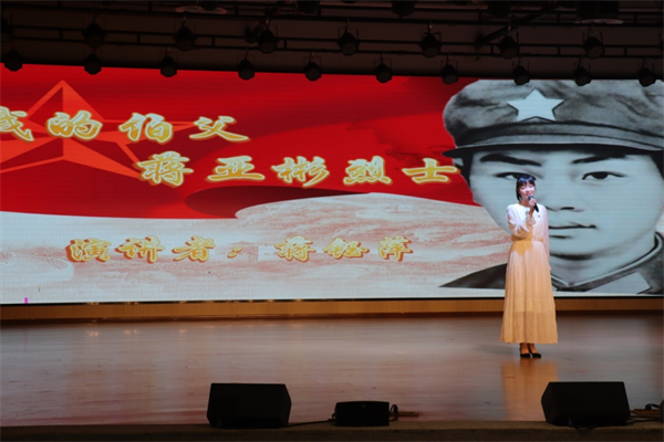 不顾个人安危,英勇作战,身负重伤仍坚守阵地,胜利完成任务却献出年轻的生命。蒋亚彬烈士的侄女蒋钰萍用铿锵的话语讲述蒋亚彬同志在对敌作战中英勇顽强和不畏牺牲的精神,讲述他带给亲人带给后人的榜样力量。