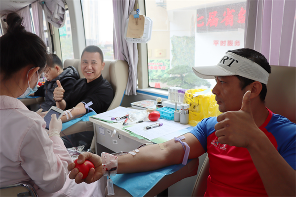 老兵赵兵(左一)与漳浦县长跑协会的跑友陈振渊(右一)结伴来献血