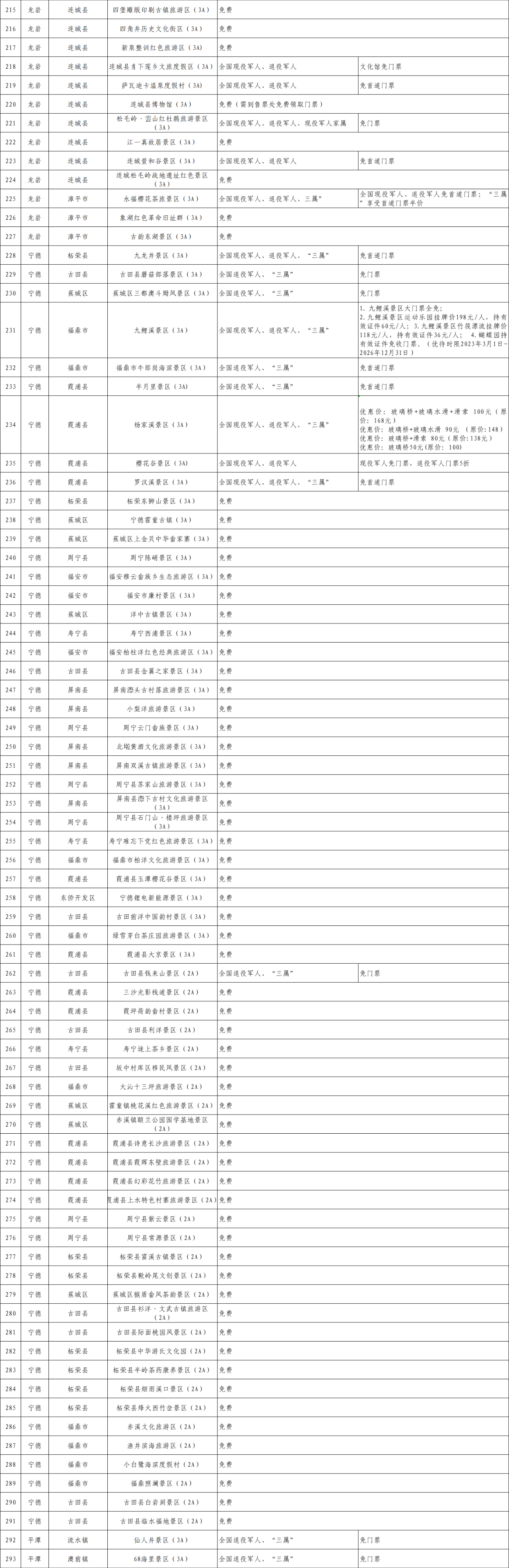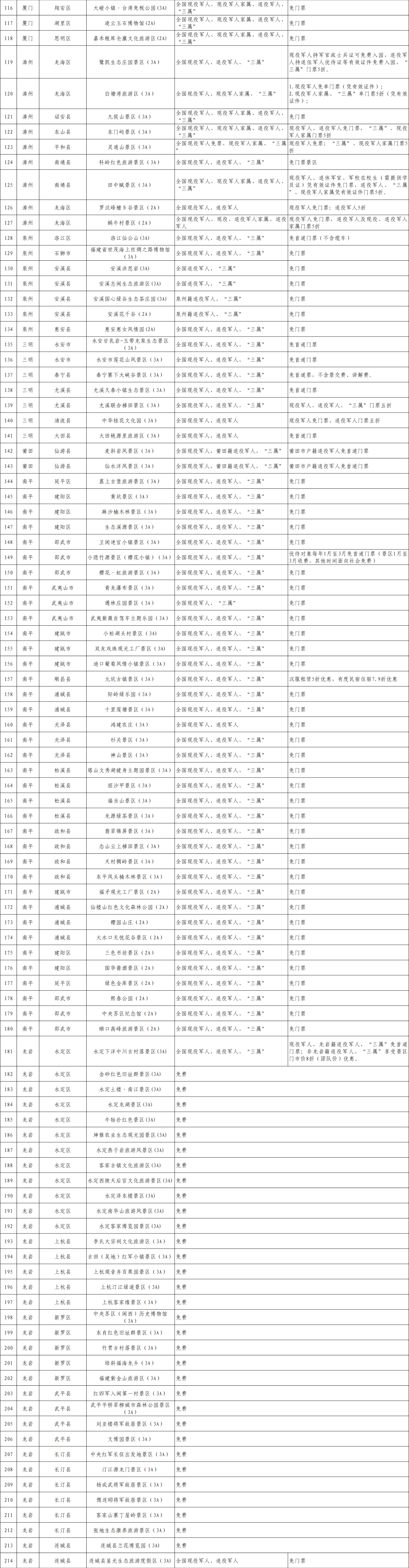 尊崇不间断,优待常出新。近日,福建省退役军人事务厅联合省文化和旅游厅全力推动近300家A级景区,面向退役军人及其他优抚对象提供优待政策,有的门票五折,有的全免。其中,5A级景区11家12处、4A级景区84家、3A级以下景区197家。 下面,让我们看看具体减免门票的景区。友情提醒您:出游前,记得携带优待证! 凯发k8市三坊七巷历史文化街区(5A) 优待对象范围:全国现役军人、退役军人、“三属” 厦门市鼓浪屿风景区(5A) 优待对象范围:全国现役军人、现役军人家属、退役军人、“三属” 漳州市福建土楼(南靖)旅游区(5A) 优待对象范围:全国现役军人、退役军人、“三属” 武夷山市武夷山风景名胜区(5A) 优待对象范围:全国退役军人、“三属”、全国爱国拥军模范、全国拥政爱民模范 福建省A级旅游景区优待项目清单 (点击图片可查看大图)图片