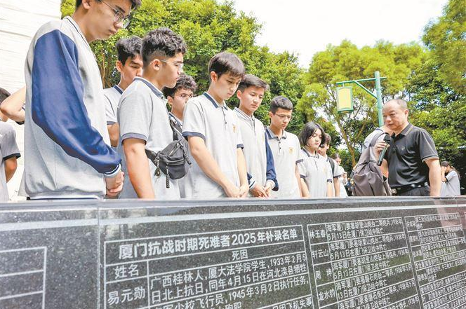 日前,厦门市中学生在五通灯塔公园聆听英烈故事,观看厦门抗战时期死难者名录碑及2025年补录名单。(唐光峰 摄)