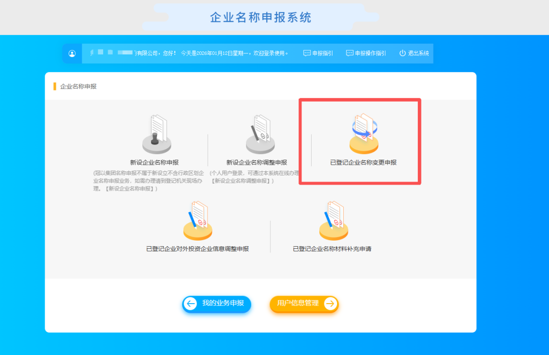 3.登录成功后,在页面选择“已登记企业名称变更申报”模块。